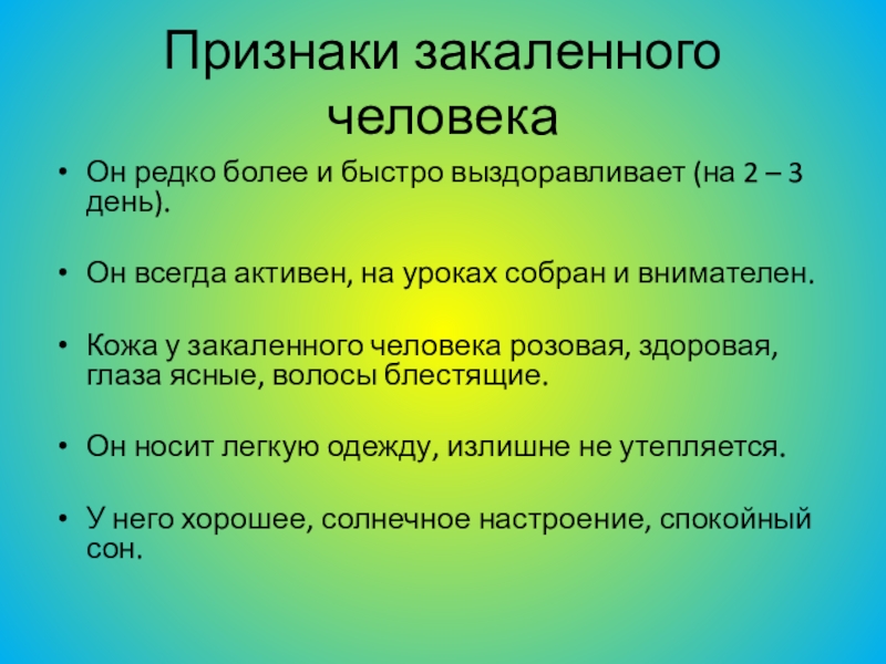 Признаки закаленного человекаОн редко более и быстро выздоравливает (на 2 – 3 день).Он всегда активен, на уроках