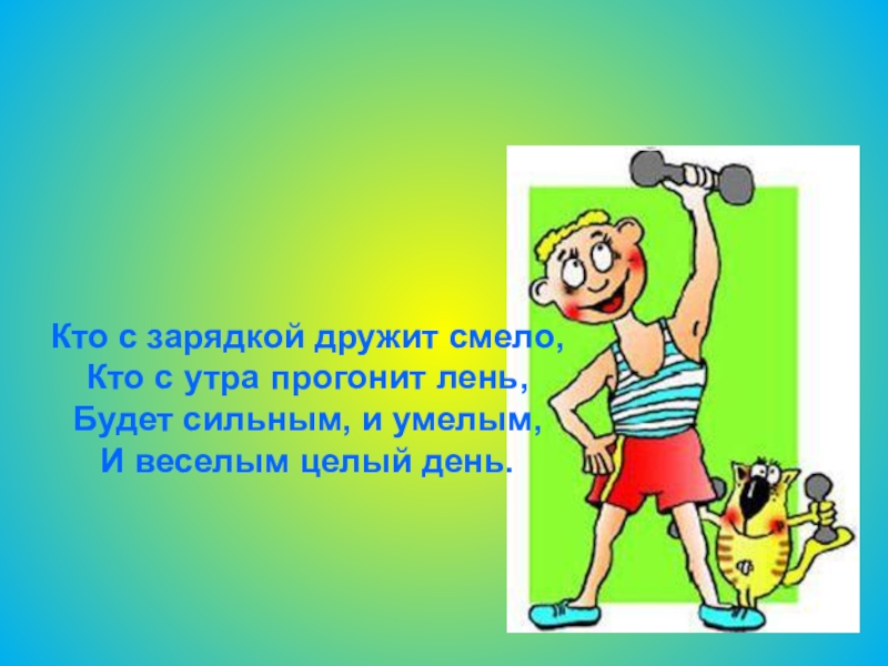 Утренняя гимнастикаКто с зарядкой дружит смело,Кто с утра прогонит лень,Будет сильным, и умелым,И веселым целый день.