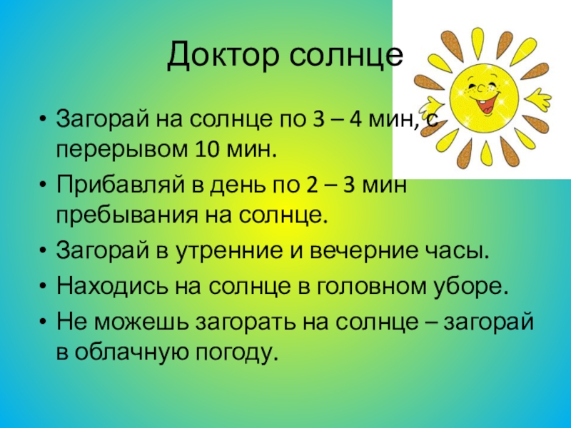 Доктор солнцеЗагорай на солнце по 3 – 4 мин, с перерывом 10 мин.Прибавляй в день по 2