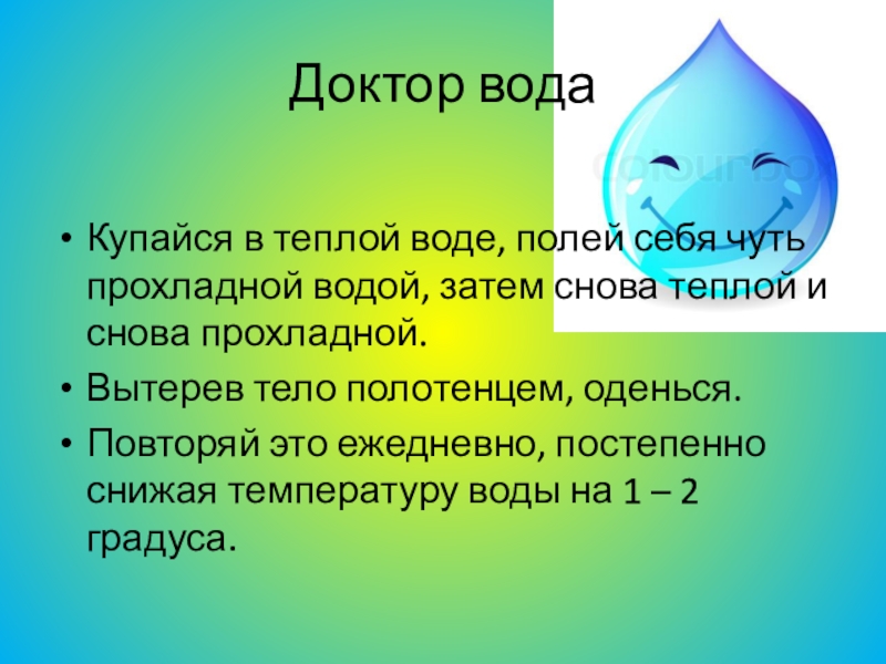 Доктор водаКупайся в теплой воде, полей себя чуть прохладной водой, затем снова теплой и снова прохладной.Вытерев тело