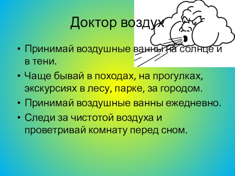 Доктор воздухПринимай воздушные ванны на солнце и в тени.Чаще бывай в походах, на прогулках, экскурсиях в лесу,