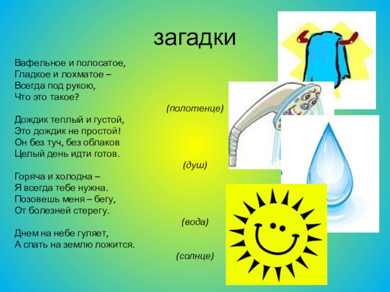 загадкиВафельное и полосатое,Гладкое и лохматое – Всегда под рукою,Что это такое?(полотенце)Дождик теплый и густой,Это дождик не простой!Он