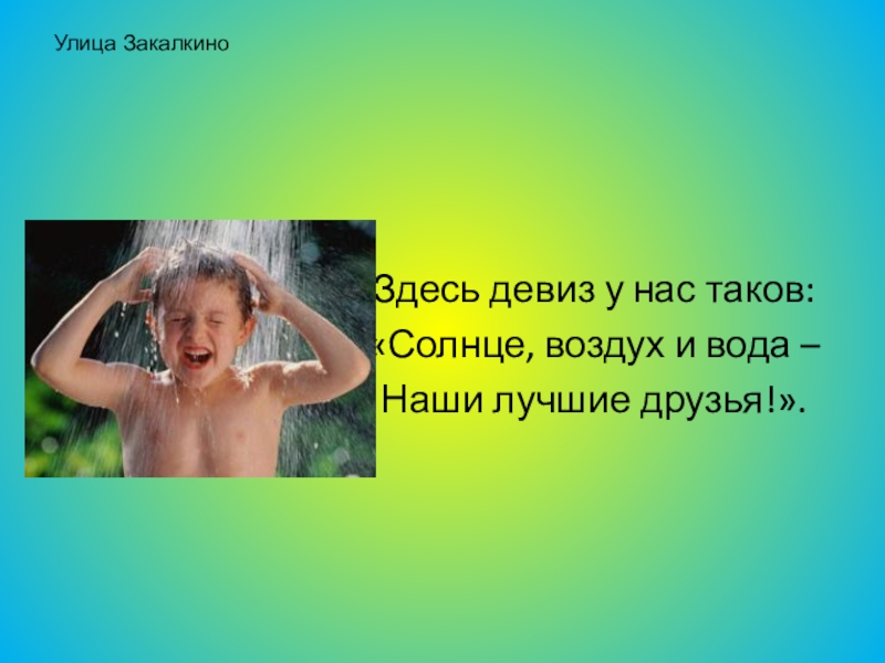 Здесь девиз у нас таков:«Солнце, воздух и вода – Наши лучшие друзья!».Улица Закалкино