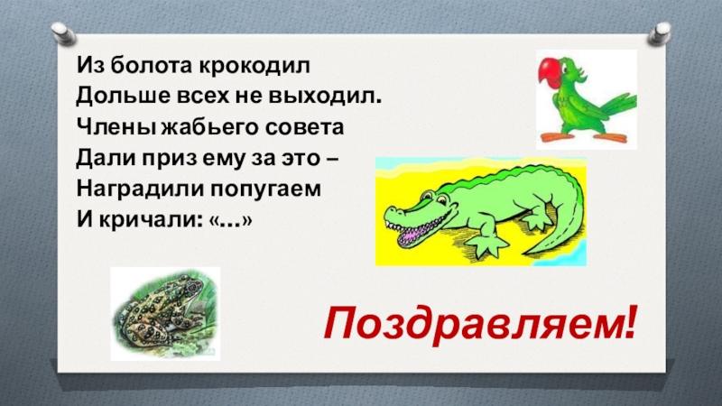Из болота крокодилДольше всех не выходил.Члены жабьего советаДали приз ему за это –Наградили попугаемИ кричали: «…»Поздравляем!