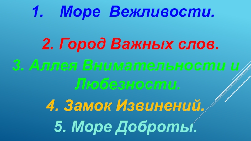 Море  Вежливости. 2. Город Важных слов. 3. Аллея Внимательности и Любезности.4. Замок Извинений.5. Море Доброты.