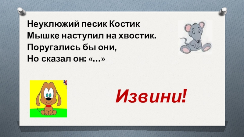 Неуклюжий песик КостикМышке наступил на хвостик.Поругались бы они,Но сказал он: «…»