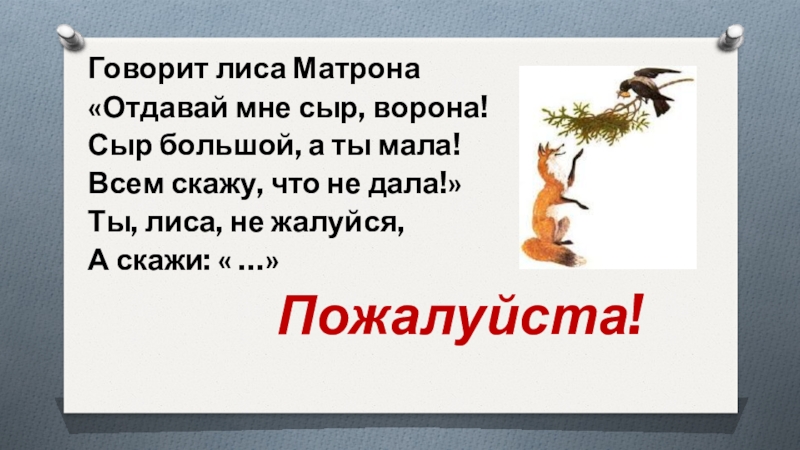 Говорит лиса Матрона«Отдавай мне сыр, ворона!Сыр большой, а ты мала!Всем скажу, что не дала!»Ты, лиса, не жалуйся,А