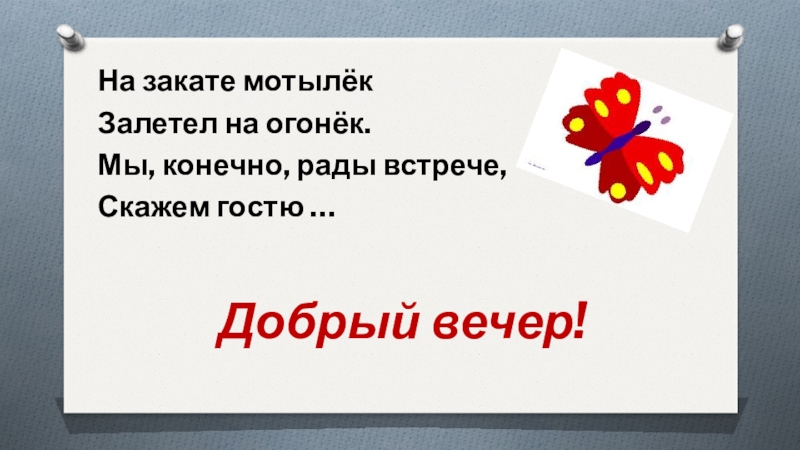 На закате мотылёкЗалетел на огонёк.Мы, конечно, рады встрече,Скажем гостю …Добрый вечер!