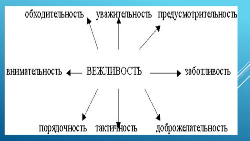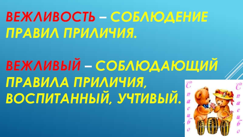 Слайд 4Вежливость – соблюдение правил приличия. Вежливый – соблюдающий правила приличия, воспитанный, учтивый.