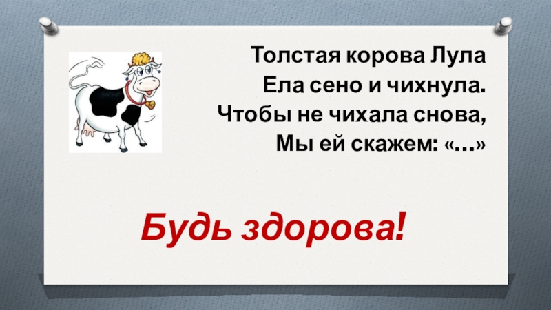 Толстая корова ЛулаЕла сено и чихнула.Чтобы не чихала снова,Мы ей скажем: «…»Будь здорова!