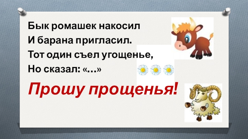 Бык ромашек накосилИ барана пригласил.Тот один съел угощенье,Но сказал: «…»Прошу прощенья!