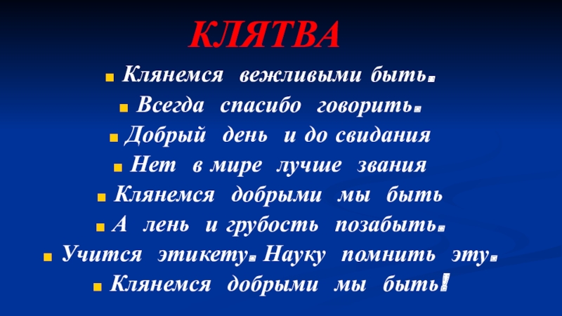 КЛЯТВАКлянемся вежливыми быть.Всегда спасибо говорить.Добрый день и до свиданияНет в мире лучше званияКлянемся добрыми мы бытьА лень