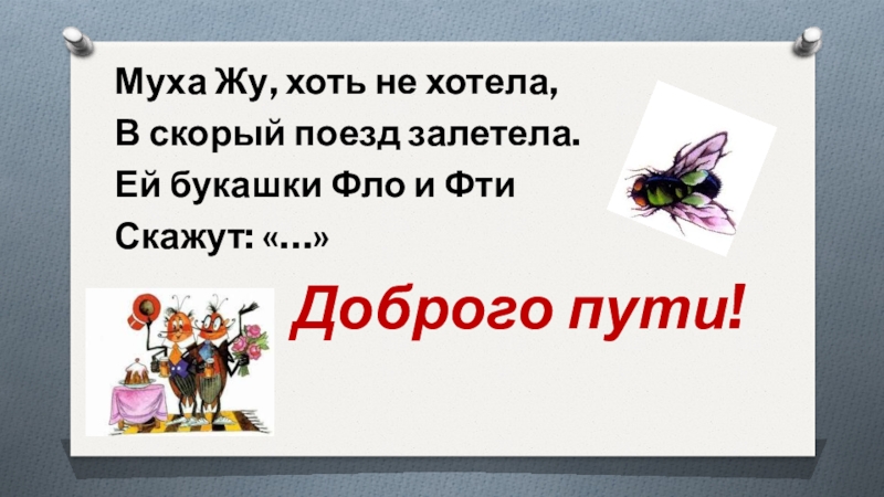 Муха Жу, хоть не хотела,В скорый поезд залетела.Ей букашки Фло и ФтиСкажут: «…»