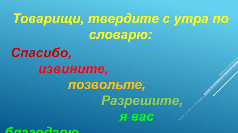 Товарищи, твердите с утра по словарю: Спасибо,     извините,