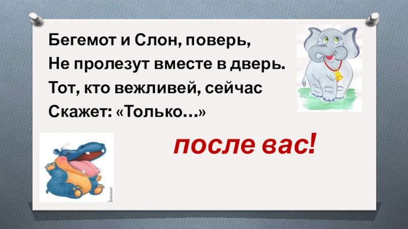 Бегемот и Слон, поверь,Не пролезут вместе в дверь.Тот, кто вежливей, сейчасСкажет: «Только…»