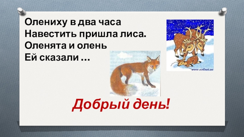 Олениху в два часаНавестить пришла лиса.Оленята и оленьЕй сказали …Добрый день!