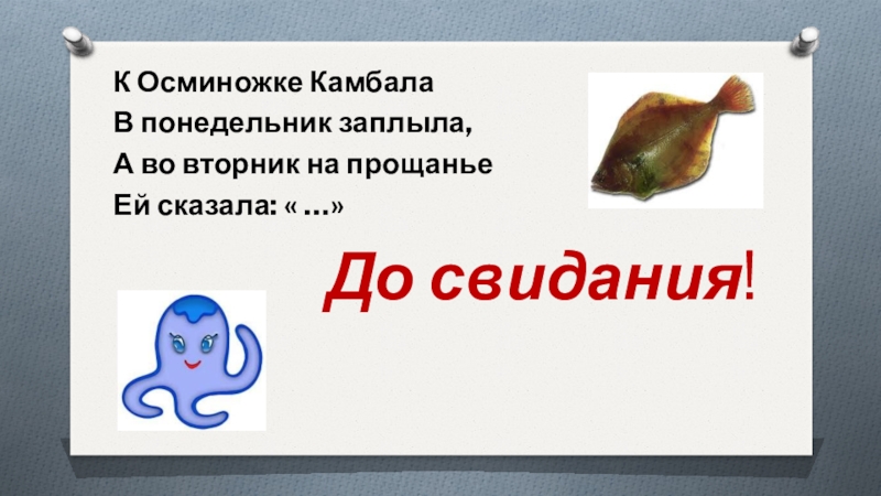 К Осминожке КамбалаВ понедельник заплыла,А во вторник на прощаньеЕй сказала: « …»До свидания!