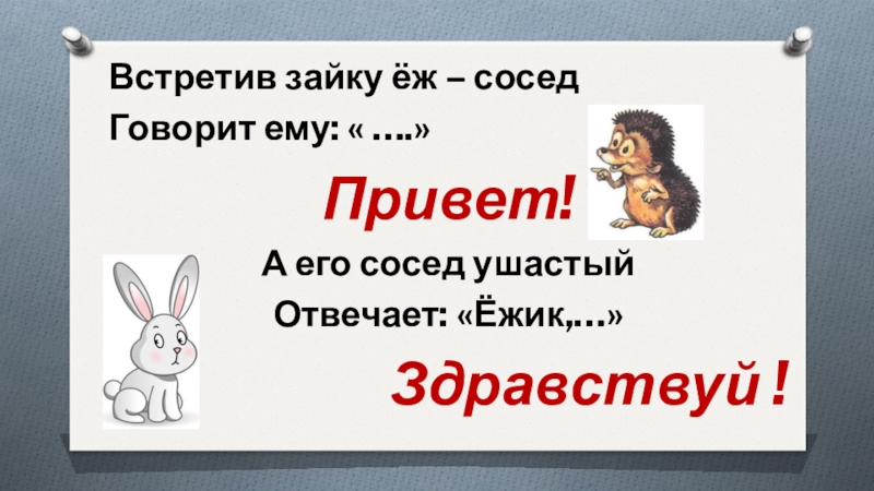 Встретив зайку ёж – соседГоворит ему: « ….»Привет!       А его сосед