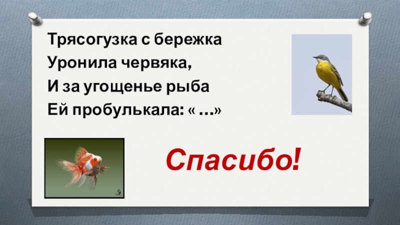 Трясогузка с бережкаУронила червяка,И за угощенье рыбаЕй пробулькала: « …»      Спасибо!