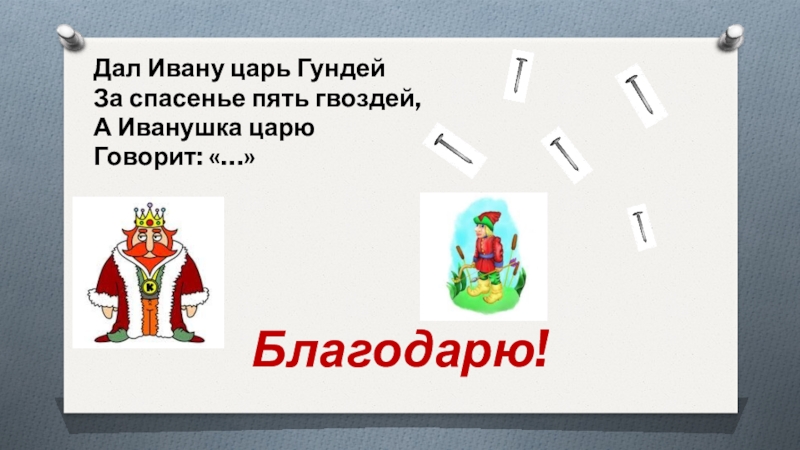 Дал Ивану царь ГундейЗа спасенье пять гвоздей,А Иванушка царюГоворит: «…»Благодарю!