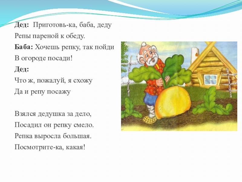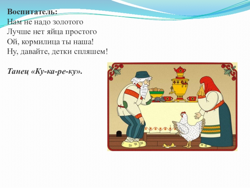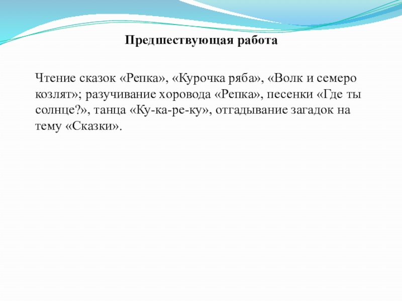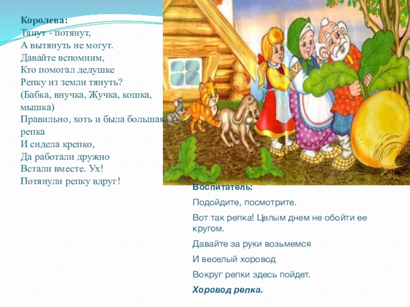 разучивание хоровода «Репка», песенки «Где ты солнце?», танца «Ку-ка-ре-ку», отгадывание загадок на тему «Сказки».