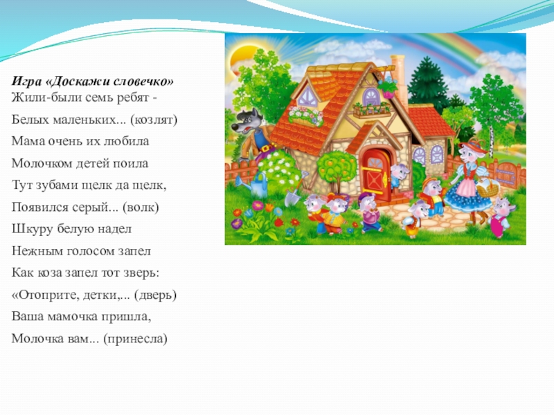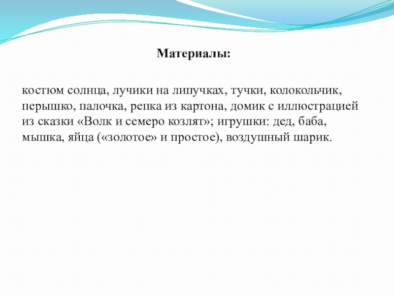 из картона, домик с иллюстрацией из сказки «Волк и семеро козлят»; игрушки: дед, баба, мышка, яйца («золотое» и простое), воздушный шарик.
