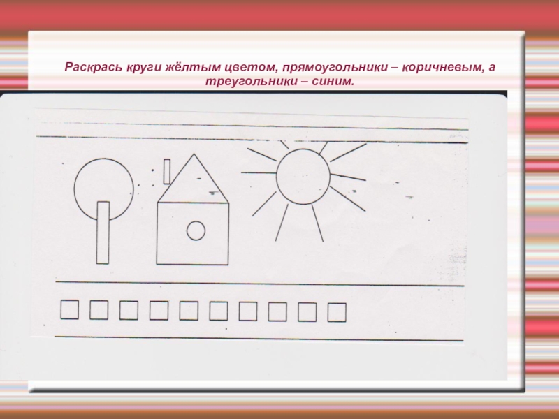 Слайд 10Раскрась круги жёлтым цветом, прямоугольники – коричневым, а треугольники – синим.