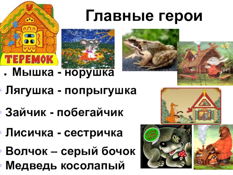Главные героиМышка - норушка Лягушка - попрыгушка Зайчик - побегайчик Лисичка - сестричка Волчок – серый бочок
