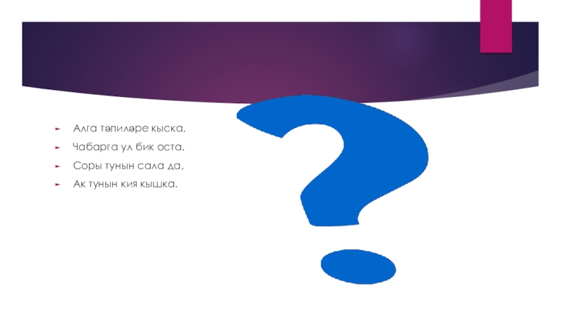 Алга тәпиләре кыска,Чабарга ул бик оста.Соры тунын сала да,Ак тунын кия кышка.