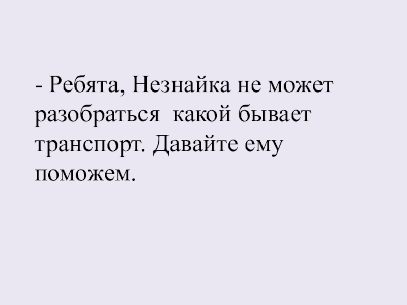 Слайд 1- Ребята, Незнайка не может разобраться какой бывает транспорт. Давайте ему