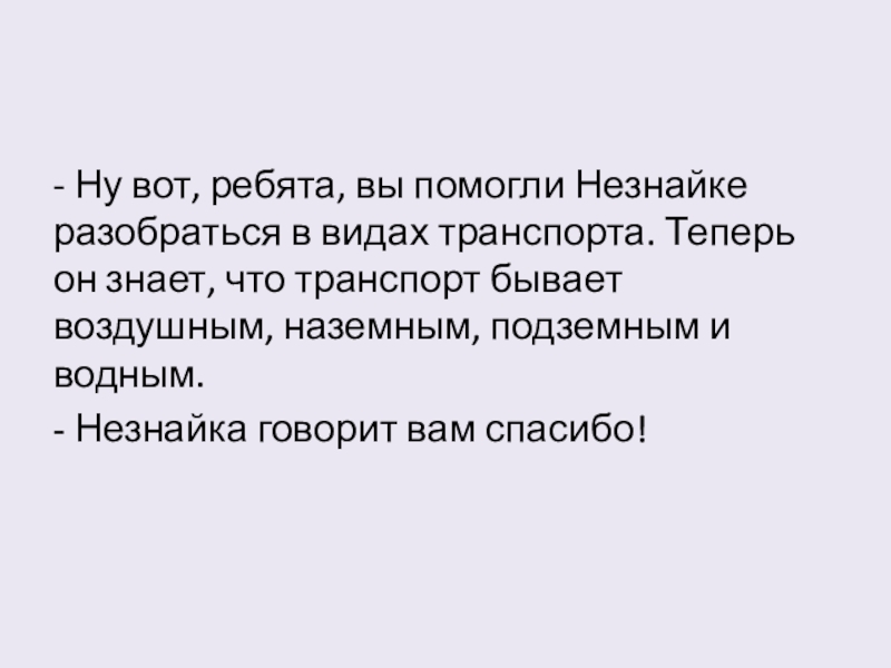 - Ну вот, ребята, вы помогли Незнайке разобраться в видах транспорта. Теперь он знает, что транспорт бывает