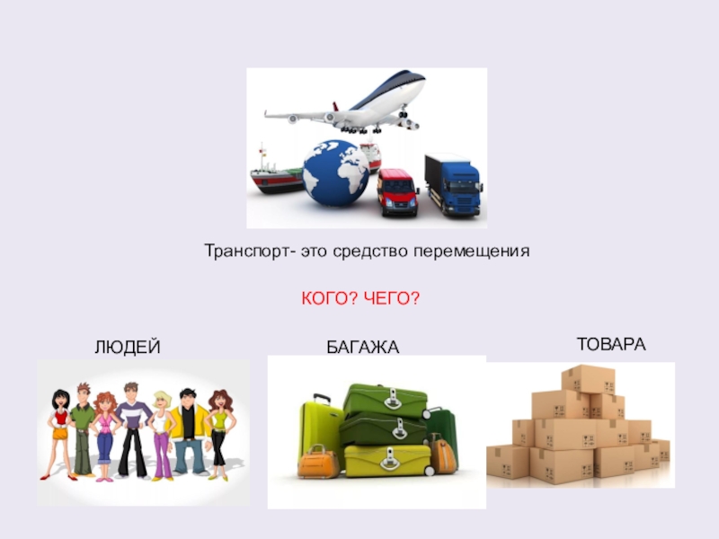 Транспорт- это средство перемещенияЛЮДЕЙТОВАРАБАГАЖАКОГО? ЧЕГО?