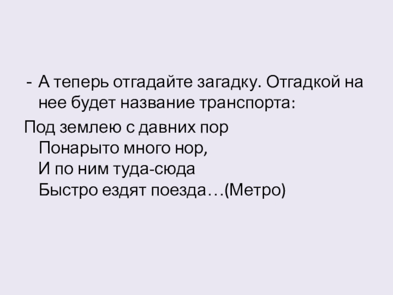 А теперь отгадайте загадку. Отгадкой на нее будет название транспорта:Под землею с давних пор Понарыто много нор,