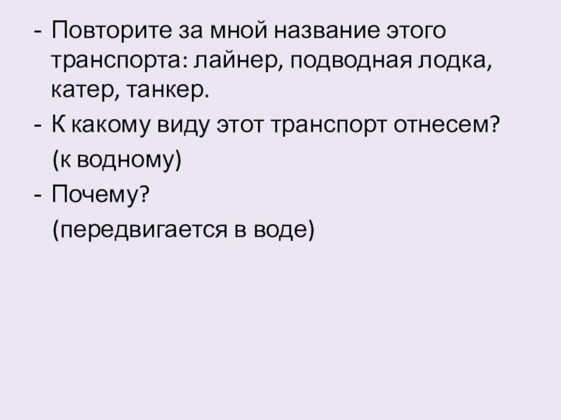 Повторите за мной название этого транспорта: лайнер, подводная лодка, катер, танкер.К какому виду этот транспорт отнесем?