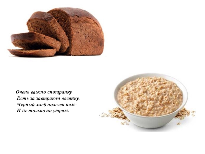 Очень важно спозаранку Есть за завтраком овсянку. Черный хлеб полезен нам- И не только по утрам.