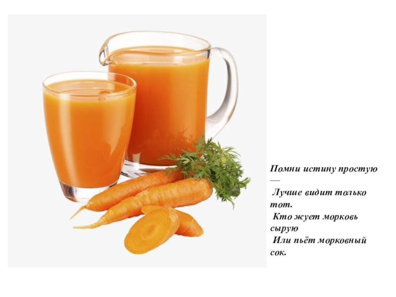 Помни истину простую — Лучше видит только тот. Кто жует морковь сырую Или пьёт морковный сок.