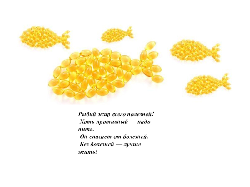 Рыбий жир всего полезней! Хоть противный — надо пить. Он спасает от болезней. Без болезней — лучше