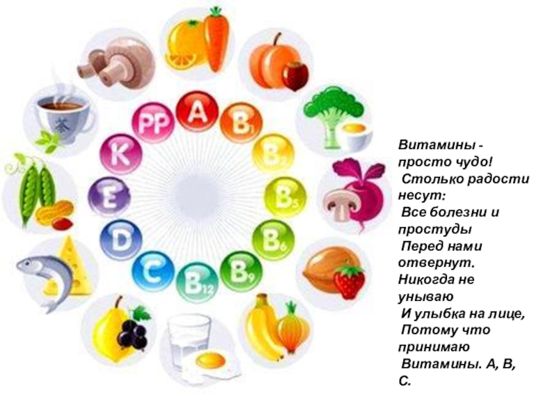 Витамины - просто чудо! Столько радости несут: Все болезни и простуды Перед нами отвернут.Никогда не унываю И