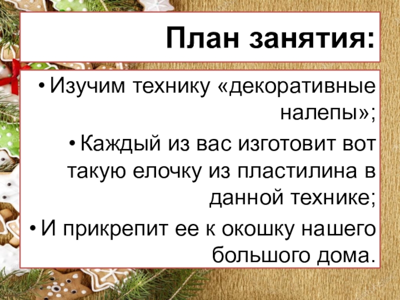 План занятия:Изучим технику «декоративные налепы»;Каждый из вас изготовит вот такую елочку из пластилина в данной технике;И прикрепит