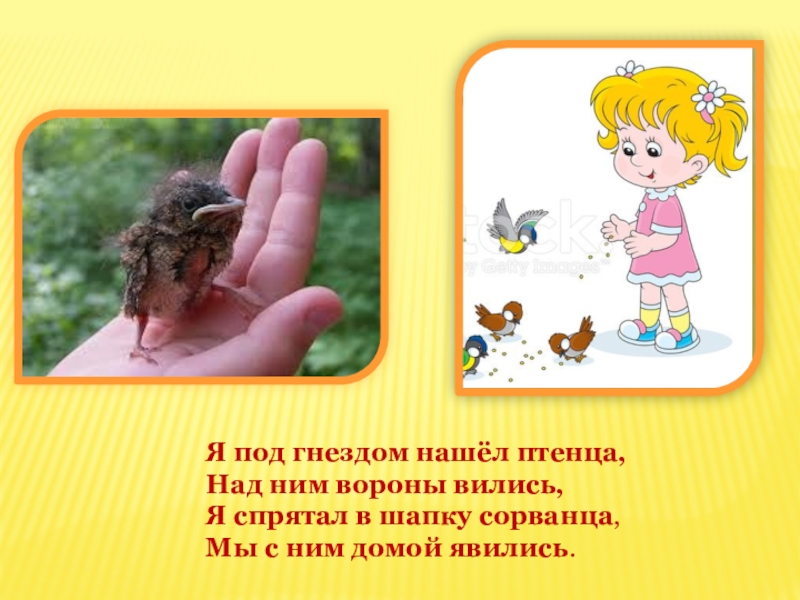 Слайд 7Я под гнездом нашёл птенца, Над ним вороны вились, Я спрятал в шапку
