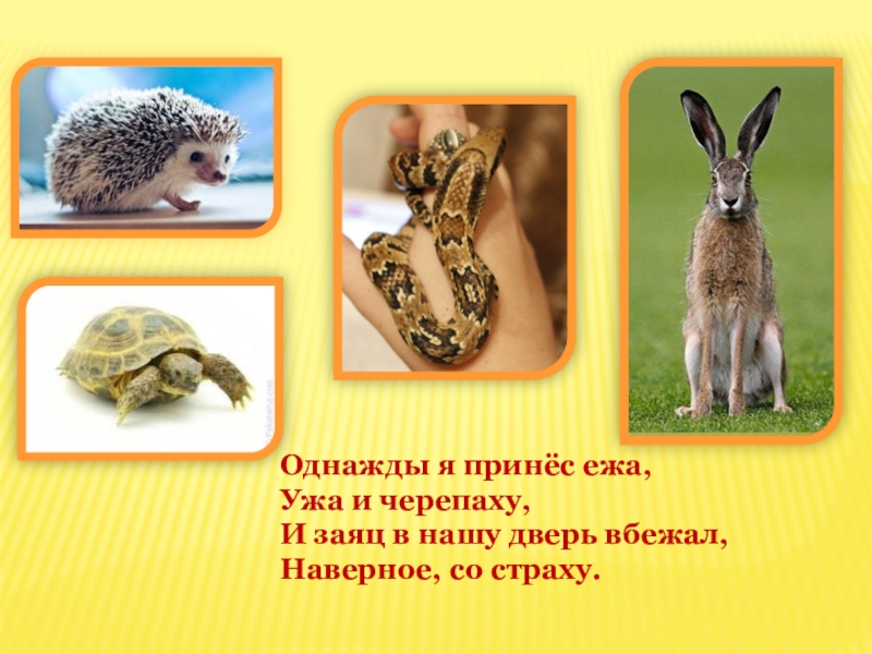 Слайд 9Однажды я принёс ежа, Ужа и черепаху, И заяц в нашу дверь вбежал, Наверное,