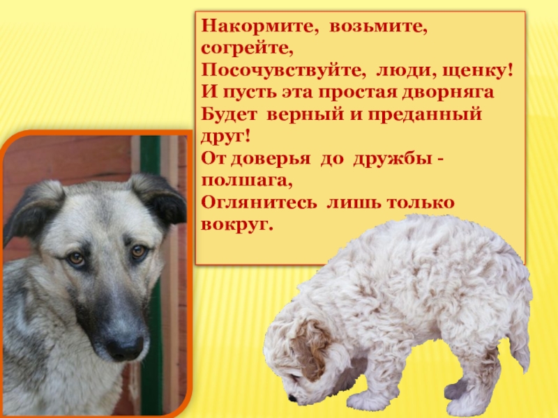 Слайд 17Накормите, возьмите, согрейте, Посочувствуйте, люди, щенку! И пусть эта простая дворняга