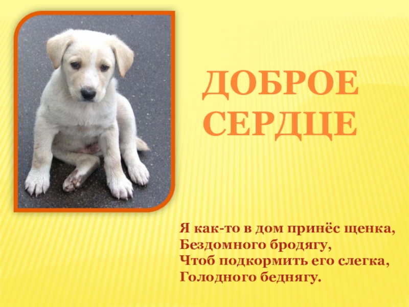Доброе сердцеЯ как-то в дом принёс щенка, Бездомного бродягу, Чтоб подкормить его слегка, Голодного беднягу.