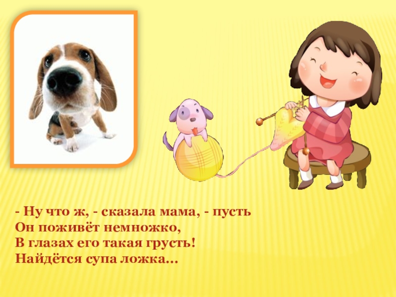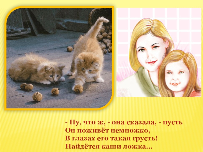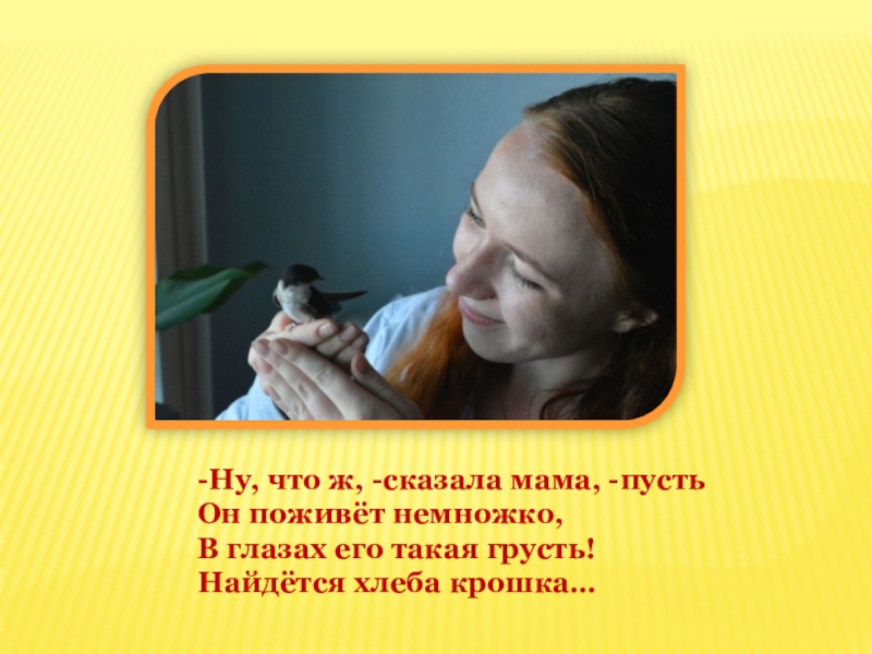 -Ну, что ж, -сказала мама, -пусть Он поживёт немножко, В глазах его такая грусть! Найдётся хлеба крошка…