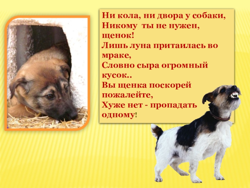 Слайд 16Ни кола, ни двора у собаки, Никому ты не нужен, щенок!