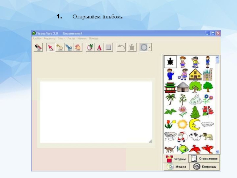 Алгоритм работы:Открываем альбом.2. Выбираем фон.3. Берём инструмент