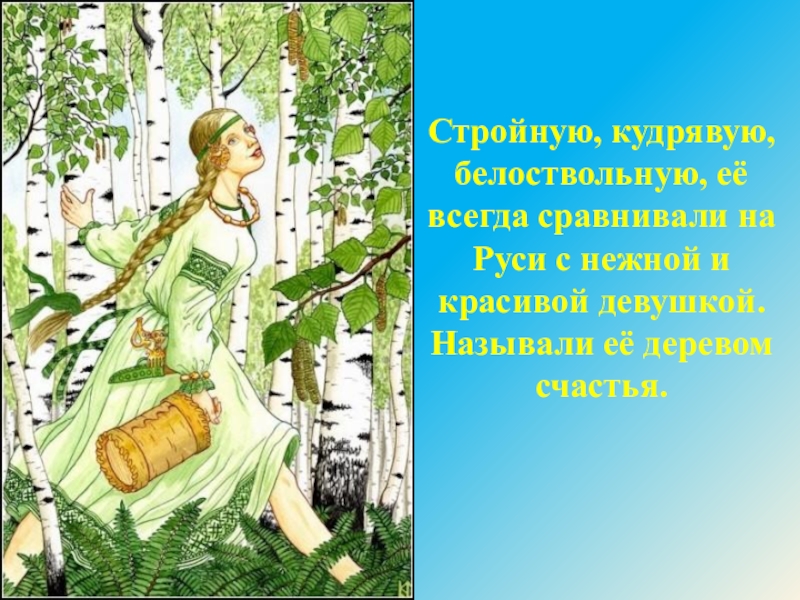 Слайд 25Стройную, кудрявую, белоствольную, её всегда сравнивали на Руси с нежной и