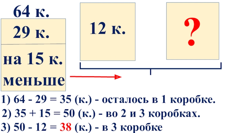 2) 35 + 15 = 50 (к.) - во 2 и 3 коробках.