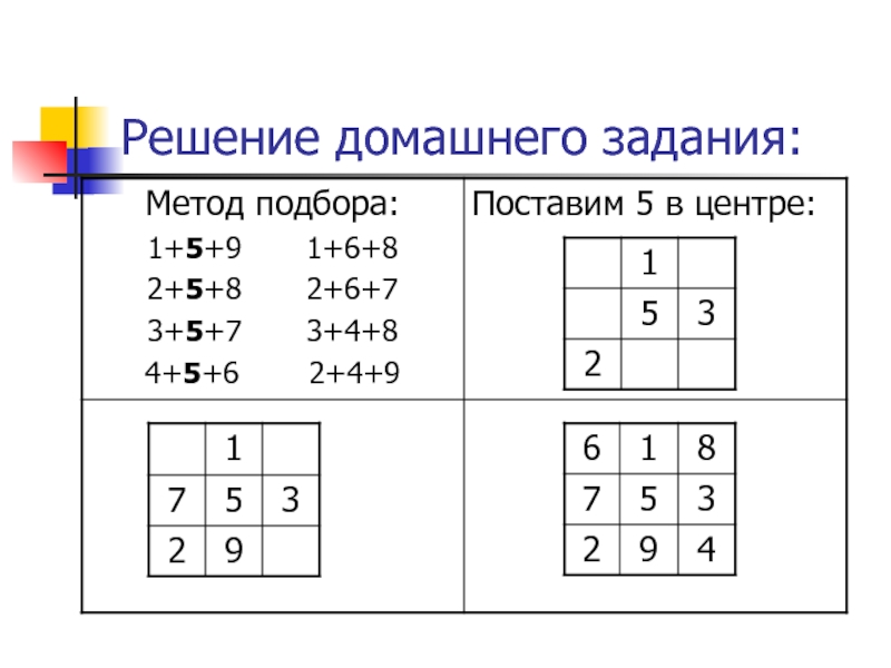 Домашнее задание. Расставьте в свободных клетках числа 4,5,6,7,8,9 так, чтобы сумма чисел в каждом столбце и каждой строке равнялась 15.