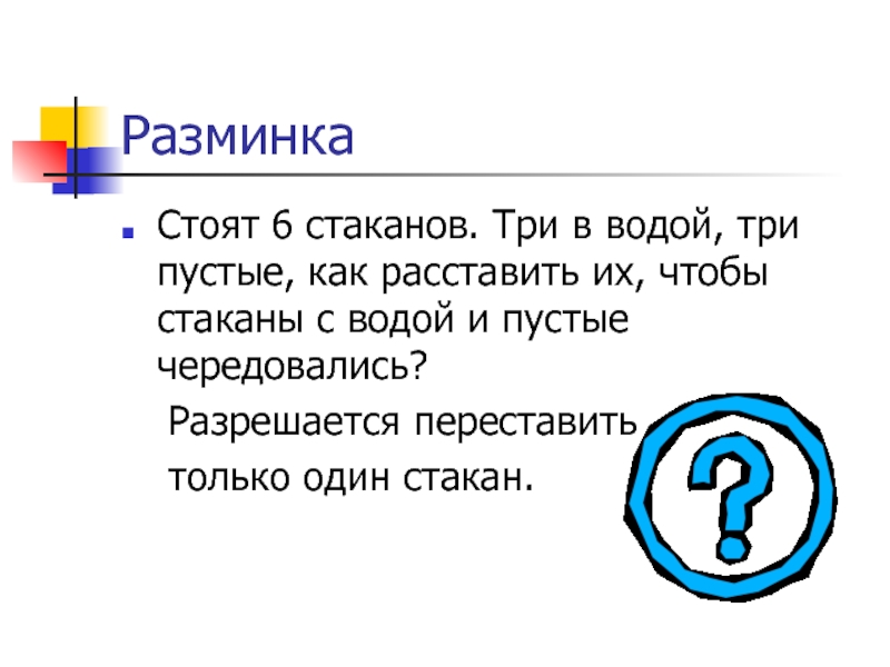 Разминка Стоят 6 стаканов. Три в водой, три пустые, как расставить их, чтобы стаканы с водой и